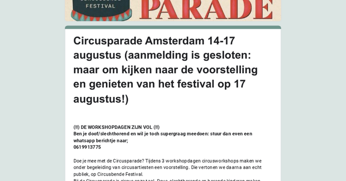 Doe je mee met de Circusparade? Tijdens 3 workshopdagen circusworkshops maken we onder begeleiding van circusartiesten een voorstelling. Die vertonen we daarna aan echt publiek, op Circusbende Festival. Bij de Circusparade is circus onze taal. Dove, slechthorende en horende kinderen maken samen een....